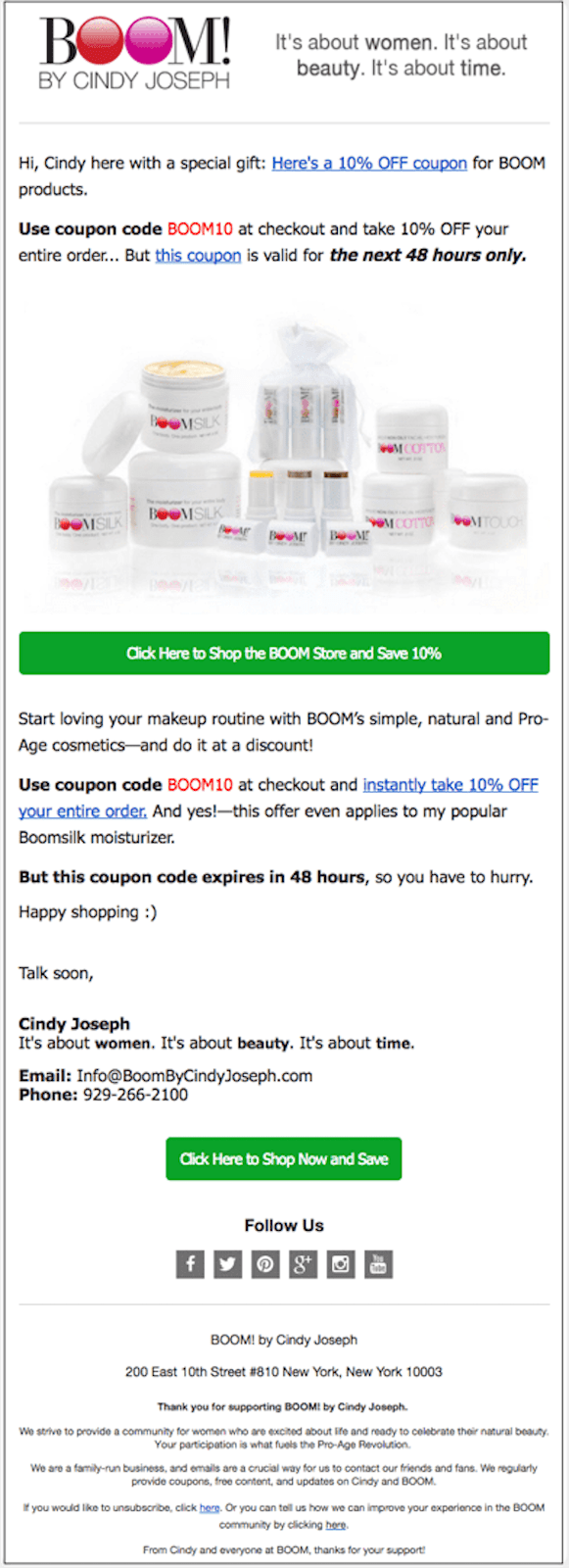 To urge the customer to take action immediately, a smart strategy is to send a final email, notifying them that the offer expires today which is their last chance of claiming their 10% off if they’re still interested. If they don’t respond, you can stop sending them emails.