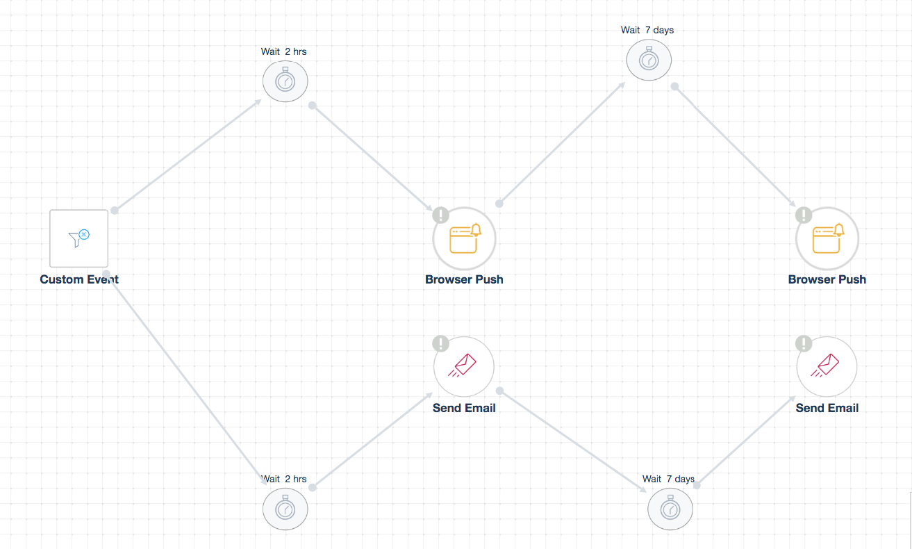 Another effective strategy to communicate with visitors is browser push notifications, especially when you do not have their email addresses. For instance, you can trigger a browser push notification that shows up 2 hours after adding the main product to a shopping cart and leaving without completing their purchase. You can also use a mix of emails and browser push messages in your workflow automation.